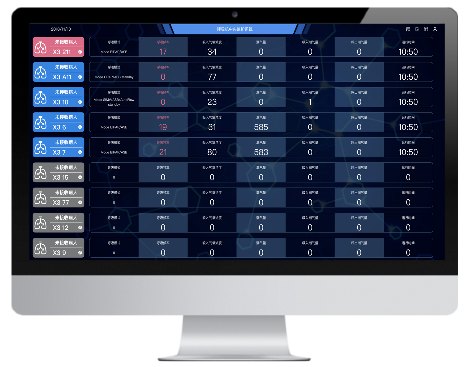 多臺不同品牌的有創(chuàng)呼吸機(jī)聯(lián)網(wǎng),并通過大屏實(shí)時(shí)集中呈現(xiàn)治療預(yù)設(shè)參數(shù)和監(jiān)測參數(shù),實(shí)現(xiàn)多臺集中監(jiān)測、集中管理和數(shù)據(jù)存儲。